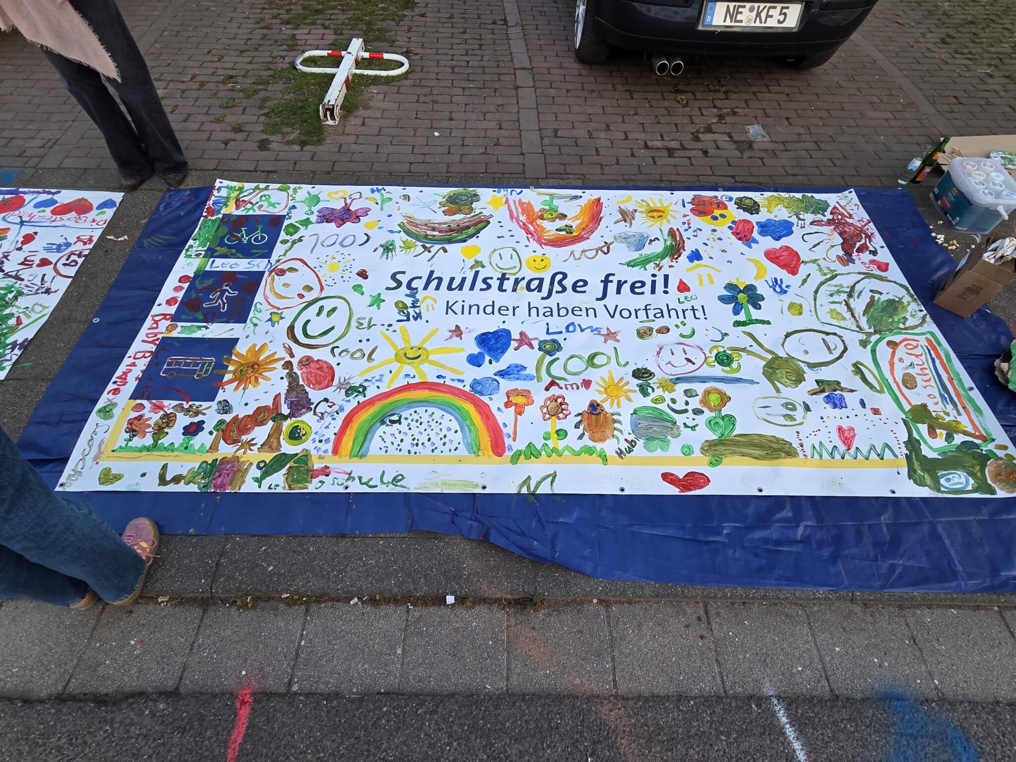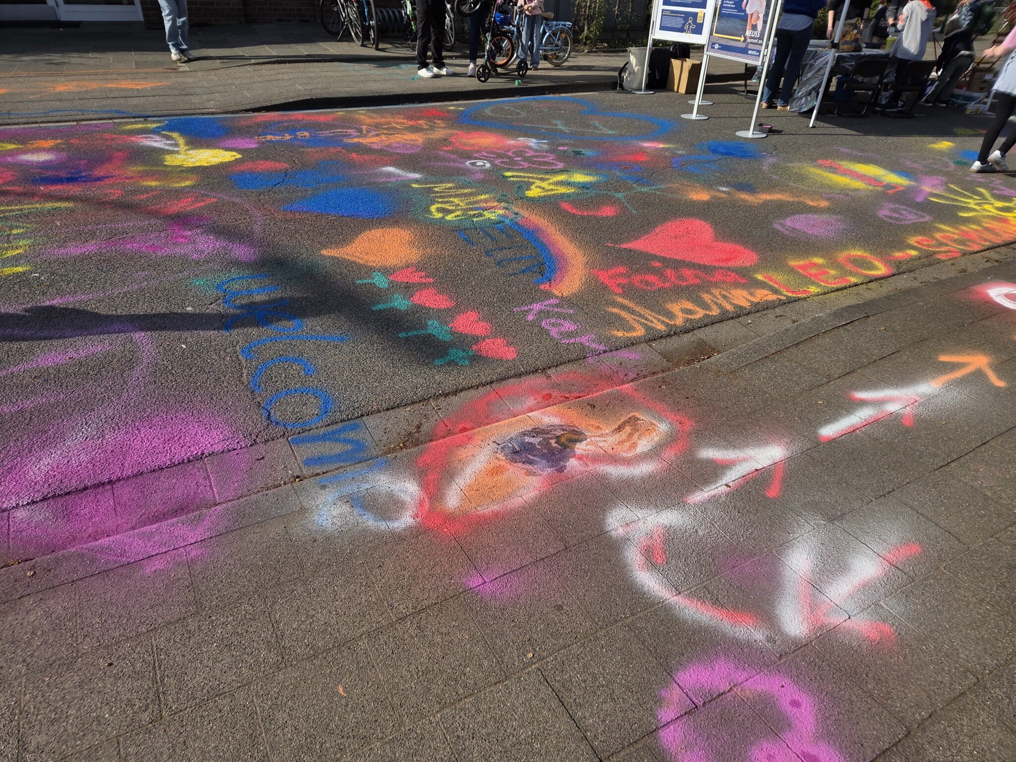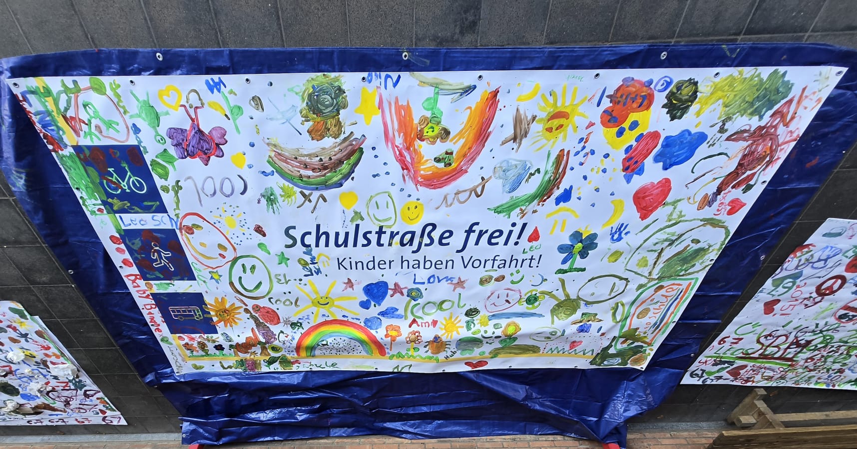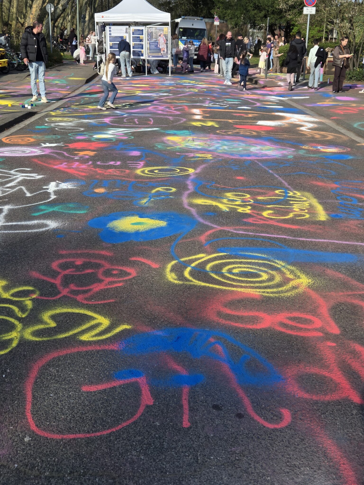 Die Kinder hatten zusätzlich die Möglichkeit, an verschiedenen Stationen selbst kreativ zu werden oder zu spielen. Ein besonderes Highlight war die bunt bemalte Schulstraße, die für eine fröhliche und einladende Atmosphäre sorgte. Zusätzlich wurden Banner bemalt, die zukünftig auf die Schulstraße aufmerksam machen sollen. Im Wendehammer wurde außerdem ein spannender Parcours für Kettcars aufgebaut, der für viel Spaß und Bewegung sorgte.